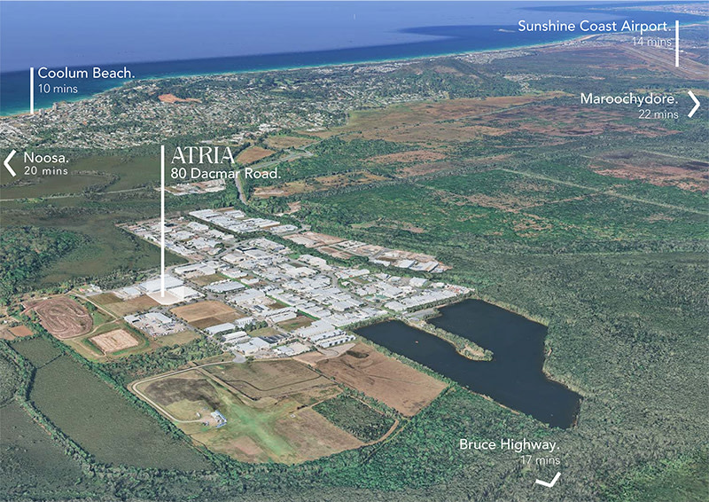 ▲ Atria at 80 Dacmar Road is within Coolum’s near-built-out industrial estate, 20 minutes from Noosa and 14 minutes from the Sunshine Coast Airport.