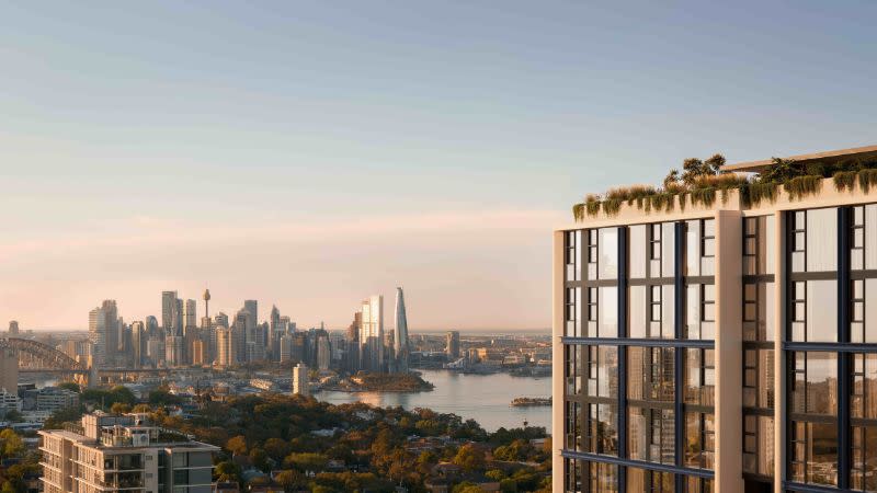 Amenities at the project 14km from the Sydney CBD include a pool, gym, golf simulator and wellness areas.