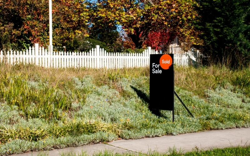 A photograph of a For Sale sign on a front verge