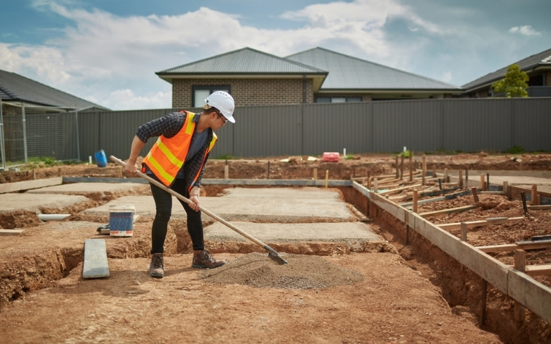 A photograph of a man working on a residential construction site.