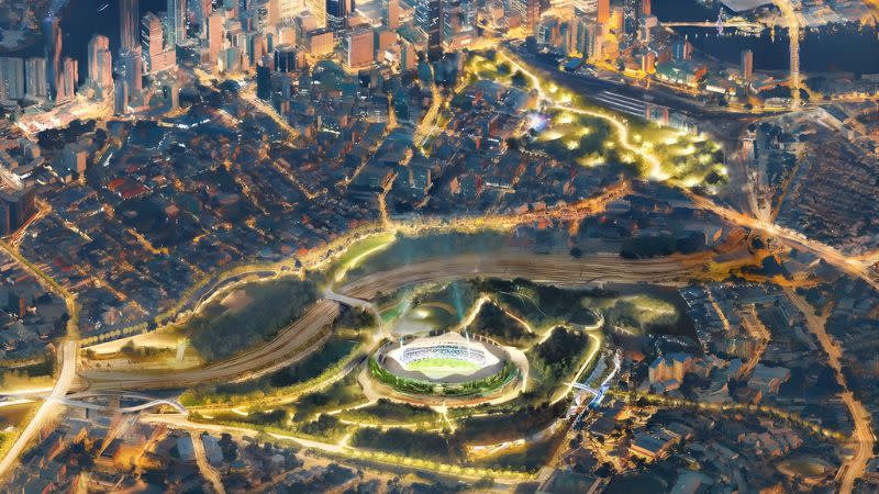 The stadium will be embedded into the site’s natural topography and feature a playing field comparable in size to the Melbourne Cricket Ground, reflecting its intended role as a premier venue for both cricket and AFL.