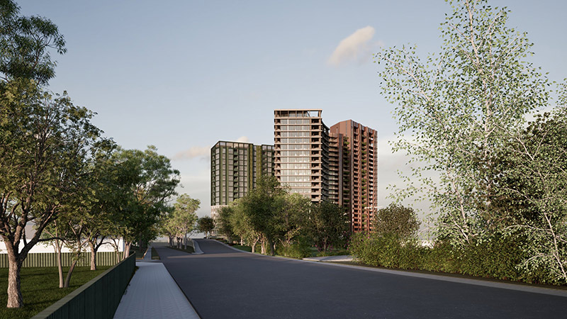 Wilson East would rise 16 storeys and deliver 158 apartments dedicated entirely to affordable housing. Track East would reach 23 storeys with 189 apartments and Track Central would comprise 21 storeys and 165 homes.