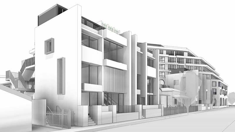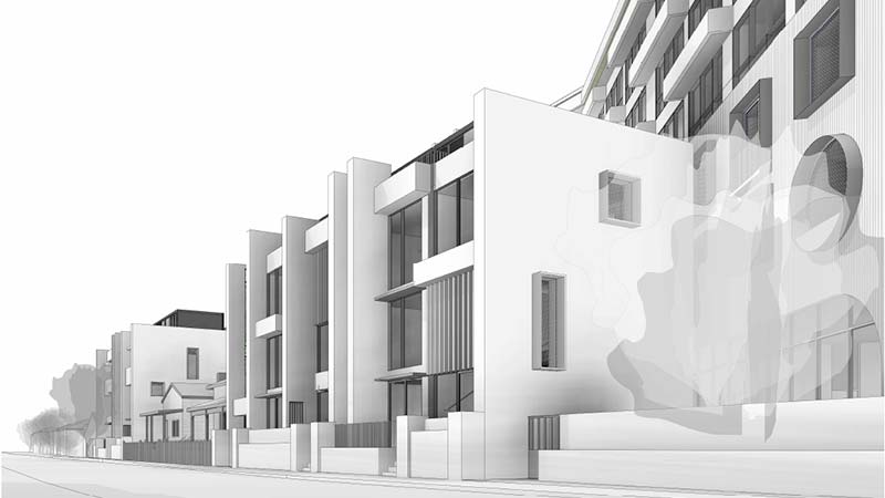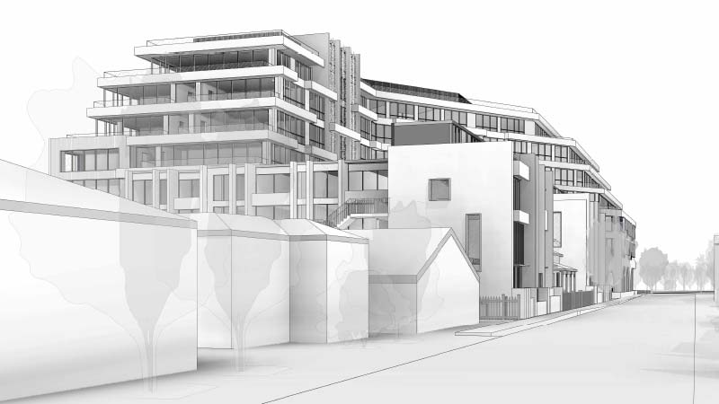 A sketch of the new hotel accommodation buildings in a residential format beside two existing heritage cottages along Havelock Street, St Kilda.