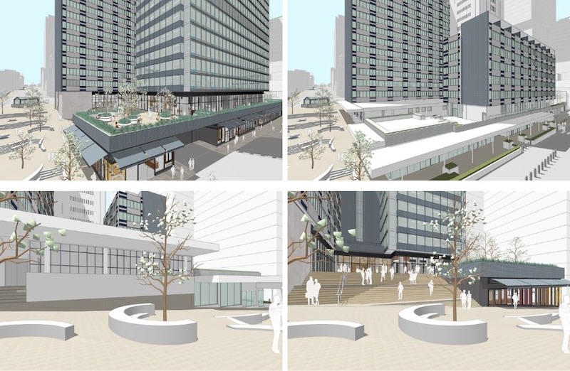 ▲ Renderings of part of the transformation design by FJCStudio: The podium terrace before and after (top) and Brett Whitely Place before and after.