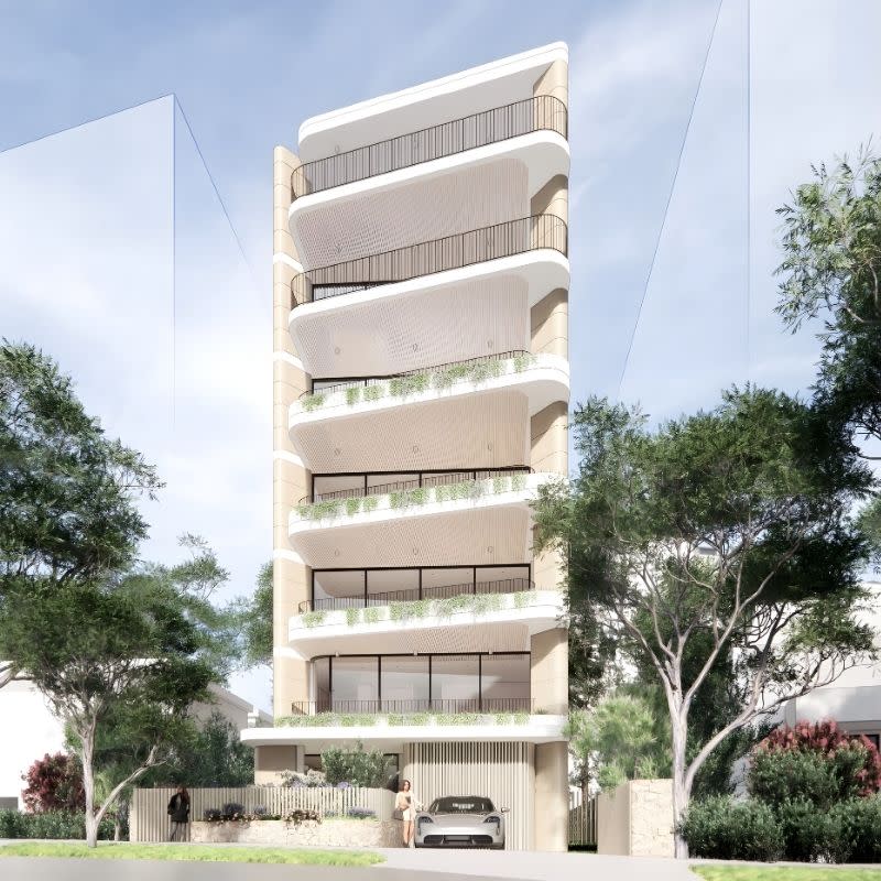 Each level above the podium would house a single apartment, with a shared rooftop garden proposed above.