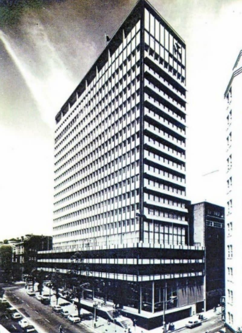 The building was designed in the late 20th century “international style” and marked a departure from other bank buildings in the area, which were traditionally built with load-bearing masonry.