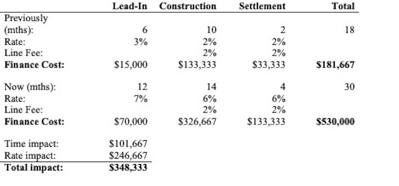 That’s nearly triple the finance cost. Just to add insult to injury, if you had to add $500,000 of mezz due to construction cost increases, finance costs rise to about $680,000—over 10 per cent of TDC – enough to hurt any feaso.