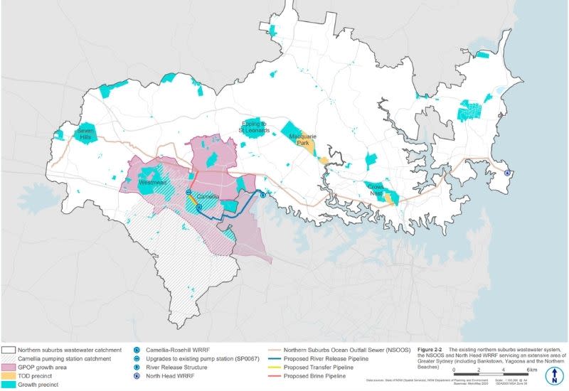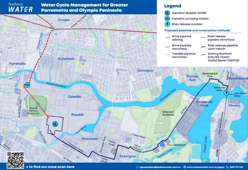 Under the proposal, wastewater diverted at Camellia would undergo advanced treatment including reverse osmosis before release into the Parramatta River near Meadowbank via a 7.6km discharge pipeline, rather than travelling to the coast for ocean outfall.
